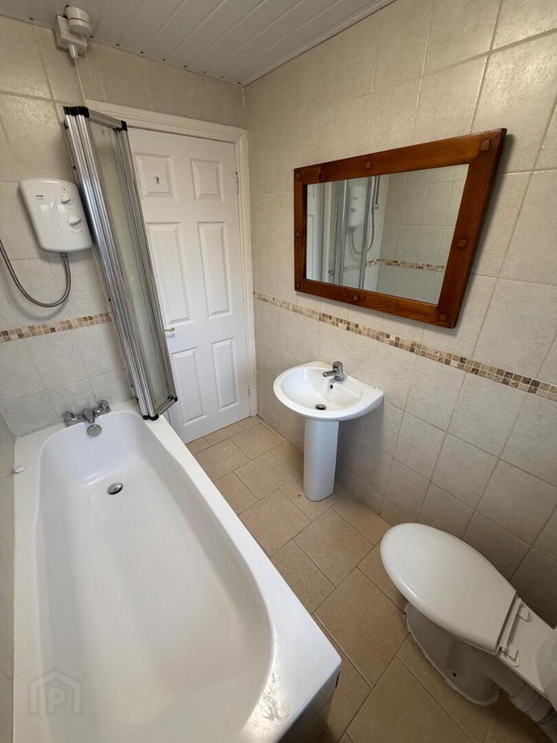 Modern bathroom suite comprising WC, wash hand basin, tiled walls and flooring, bath tub and electric shower.