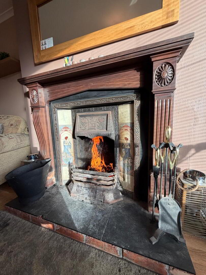 Generous family living space with frontal views, wooden flooring, TV and electrical points, and a welcoming open fire with back burner, perfect for creating a warm, comfortable atmosphere.