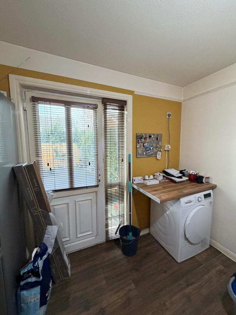 Well proportioned open plan kitchen and dining area overlooking the private rear garden. Includes tiled flooring, a range of high and low level units, modern appliances, and double patio doors opening directly to the garden’s stone slabs and decking, ideal for indoor/outdoor living.