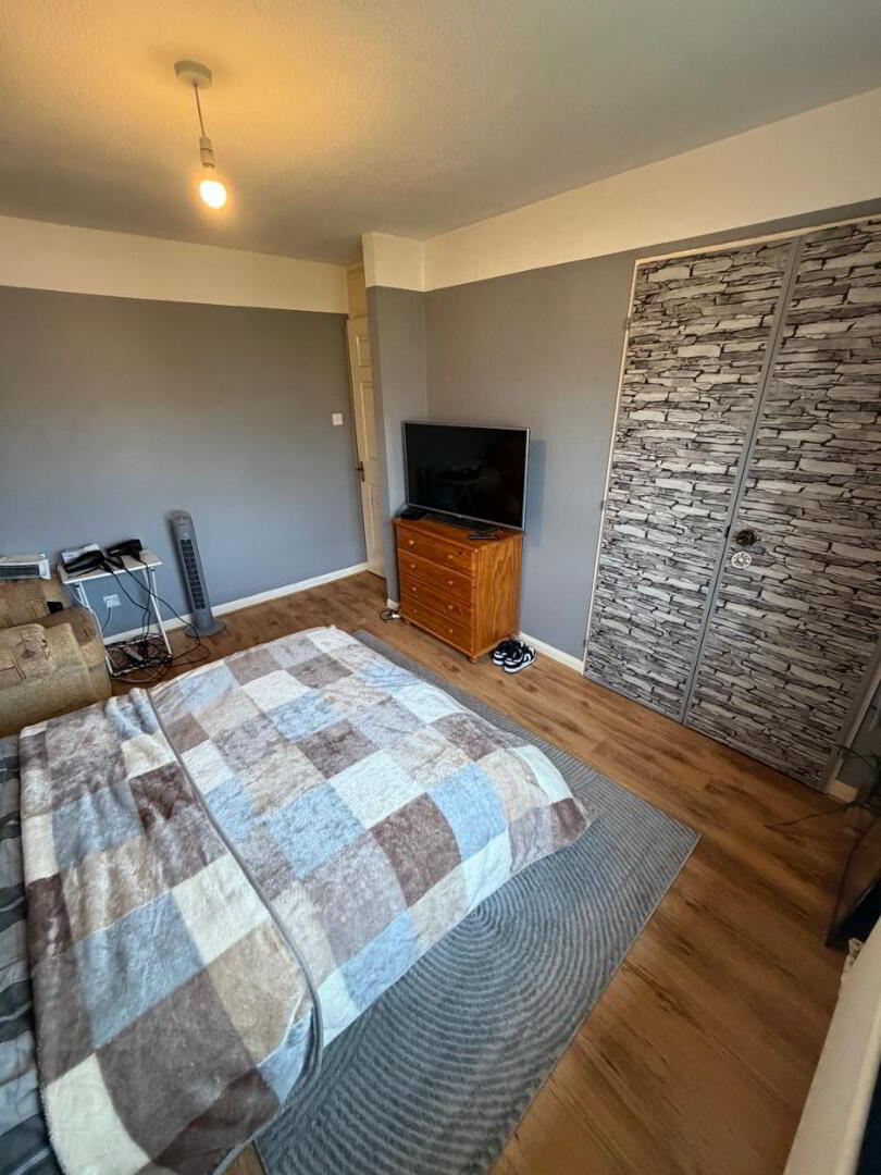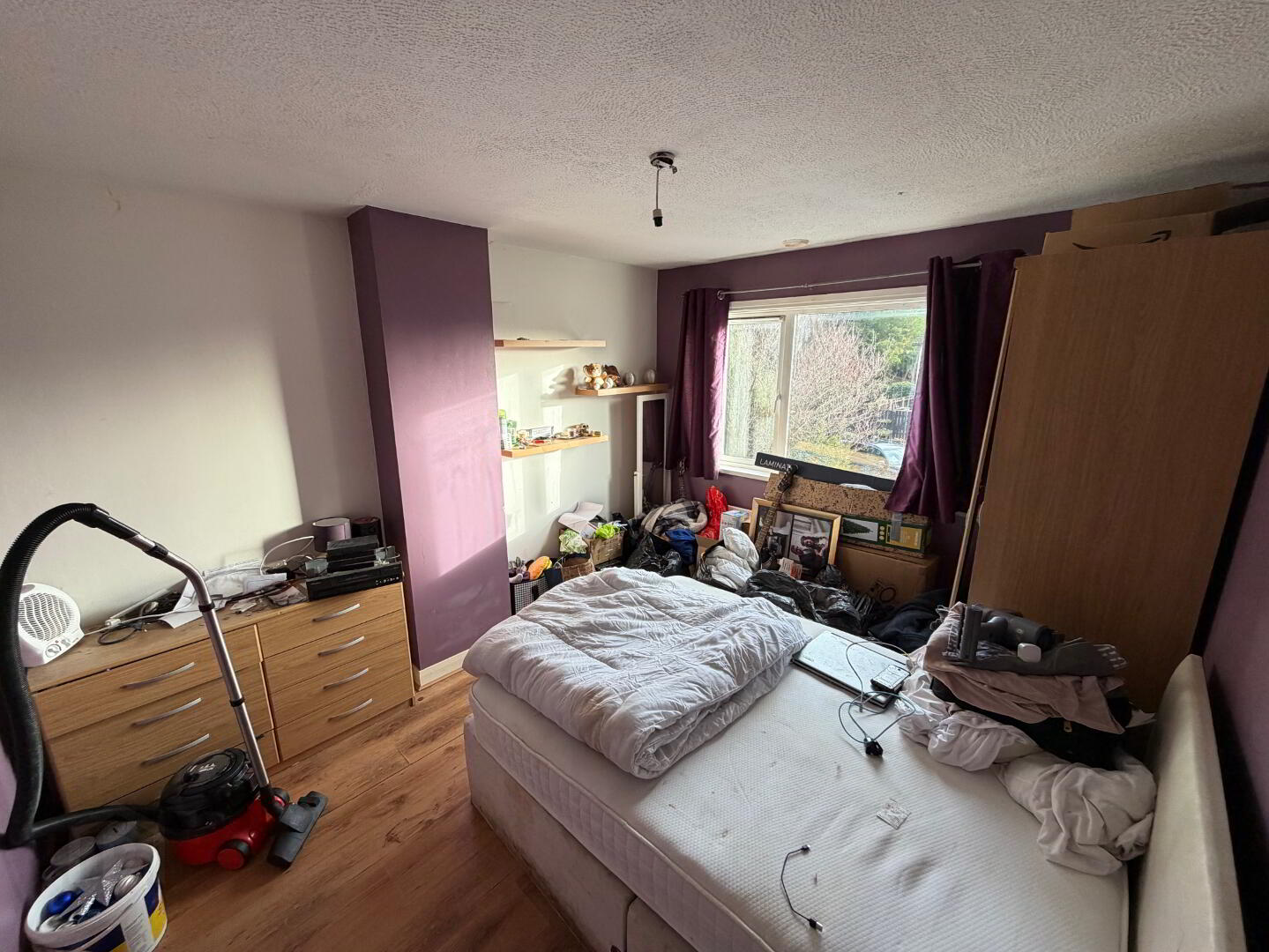 Bright, spacious double bedroom with wooden flooring and excellent storage opportunities, including a separate storage room, views of the rear of the property.