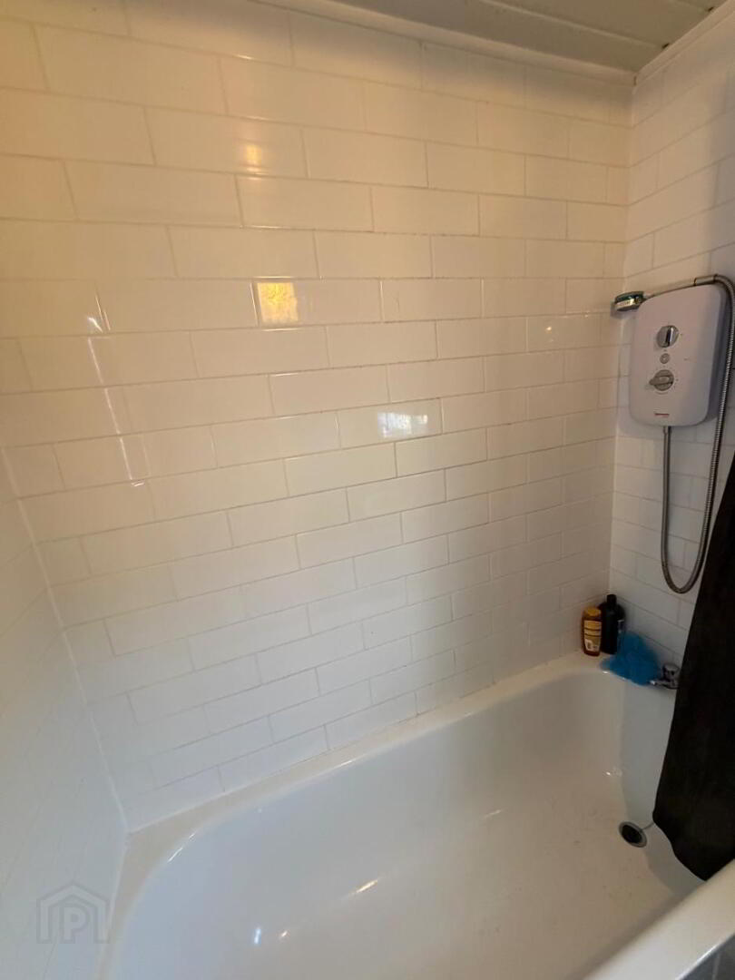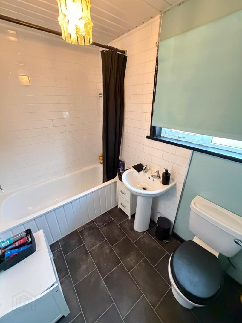 Bathroom suite including WC, wash hand basin, tiled walls and floor, bath, and electric shower.